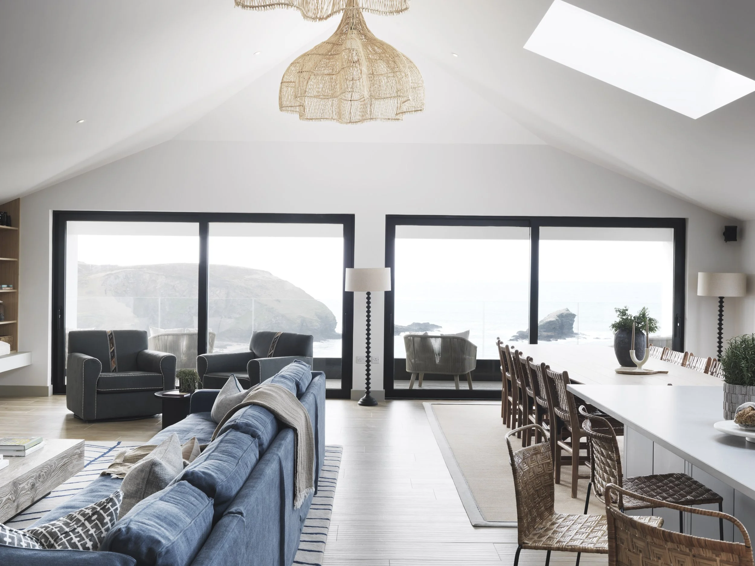 An imposing 6 bedroom house perched on the edge of the North Coast of Cornwall. Renovated and reworked to luxury Holiday home standard. With a cinema, bar, alfresco dining, and hot tub with stunning views, this beautiful home appeals to multi generational families and large celebratory groups.